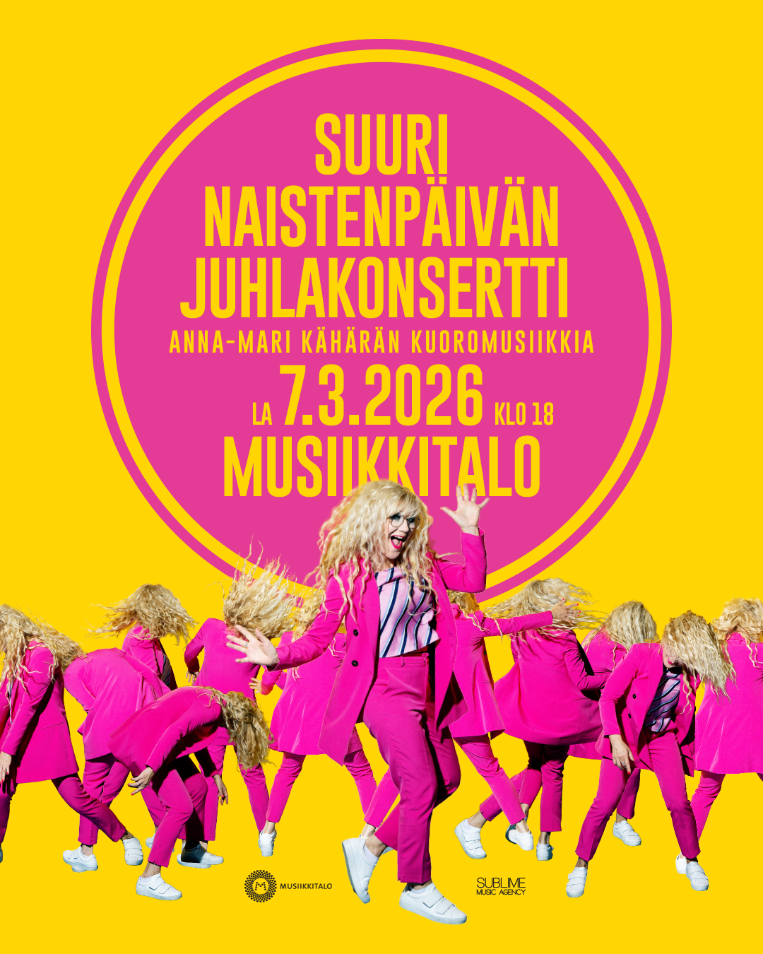 Säveltäjä, muusikko Anna-Mari Kähärän emännöimä suuri naistenpäivän juhlakonsertti on muodostunut jo perinteeksi, joka täyttää Konserttisalin. Nyt Naiskuoroliitto tekee yhteistyötä Anna-Mari Kähärän ja konsertin tuottavan Sublime Music Agency Oy:n kanssa, jotta Musiikkitalon Konserttisali avautuu kaikille Suomen Naiskuoroliiton jäsenkuoroille muutenkin kuin kuulijan ominaisuudessa. Teillä on harvinaislaatuinen mahdollisuus laulaa niin kaikkien laulajien muodostamassa suurkuorossa kuin esiintyä maamme eturivin näyttelijän kanssa - yli tuhatpäiselle yleisölle. Ohjelmisto koostuu Anna-Mari Kähärän teoksista.